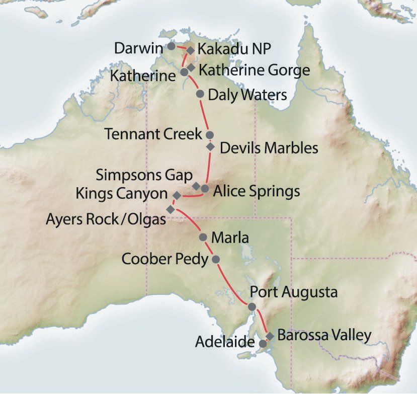 - Highlights u.a. Coober Pedy, Ayers Rock, Kings Canyon, Devils Marbles, Katherine Gorge, Kakadu Nationalpark