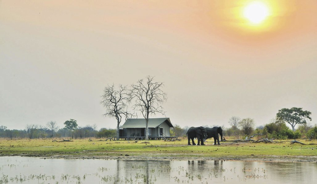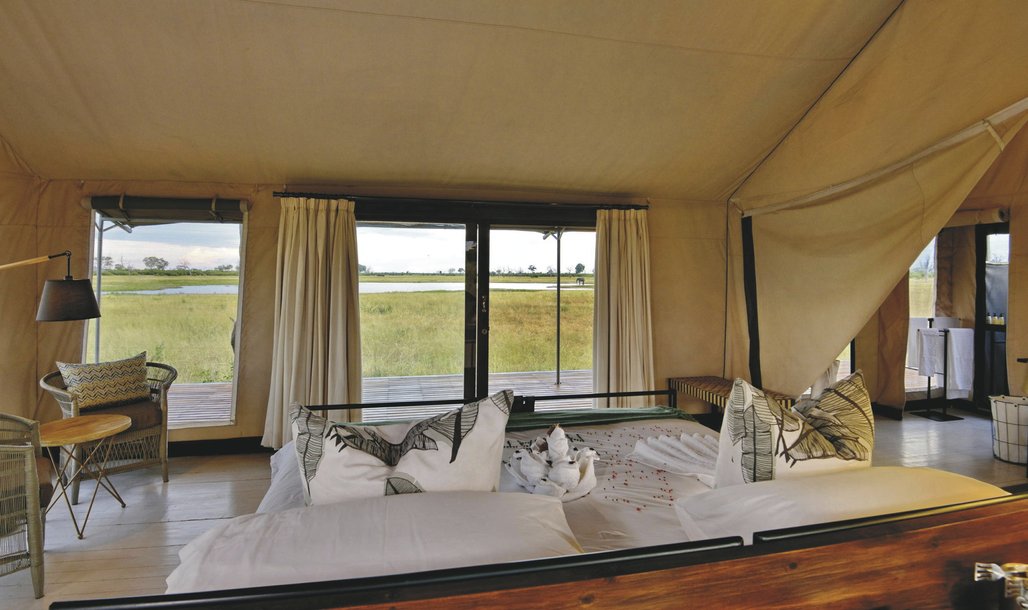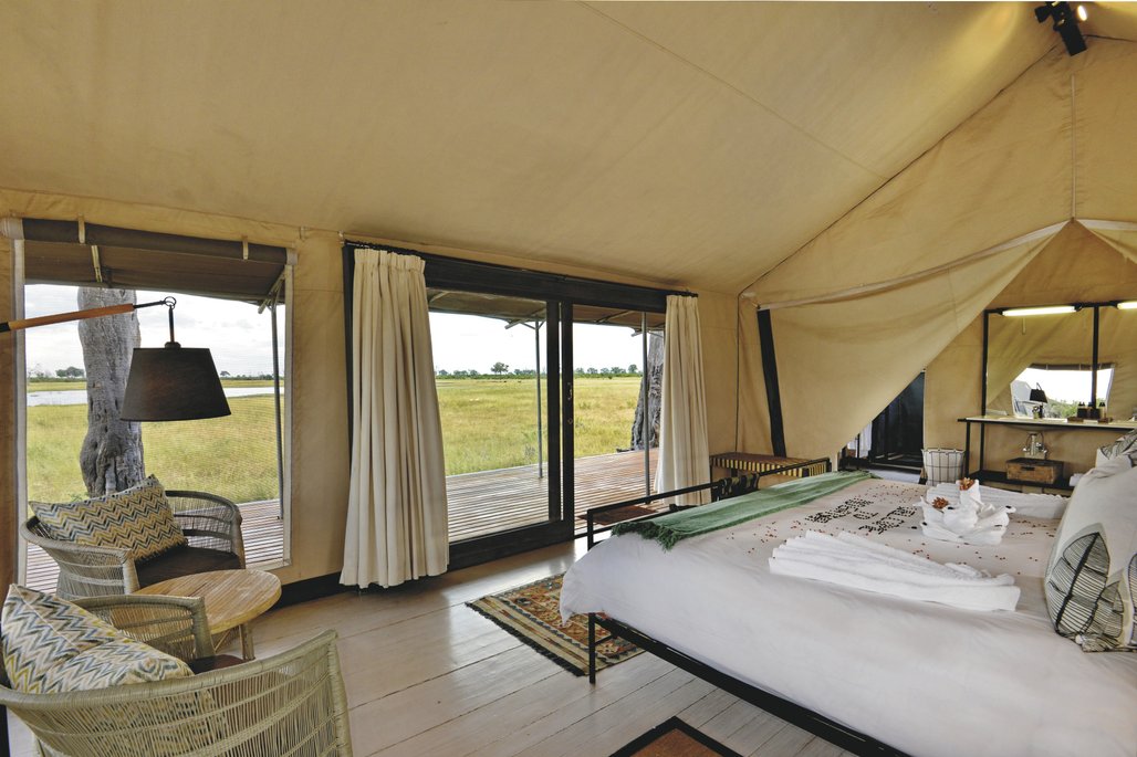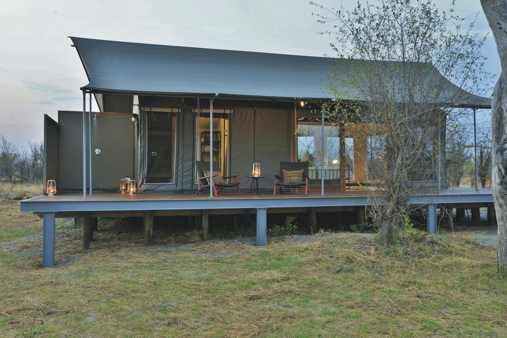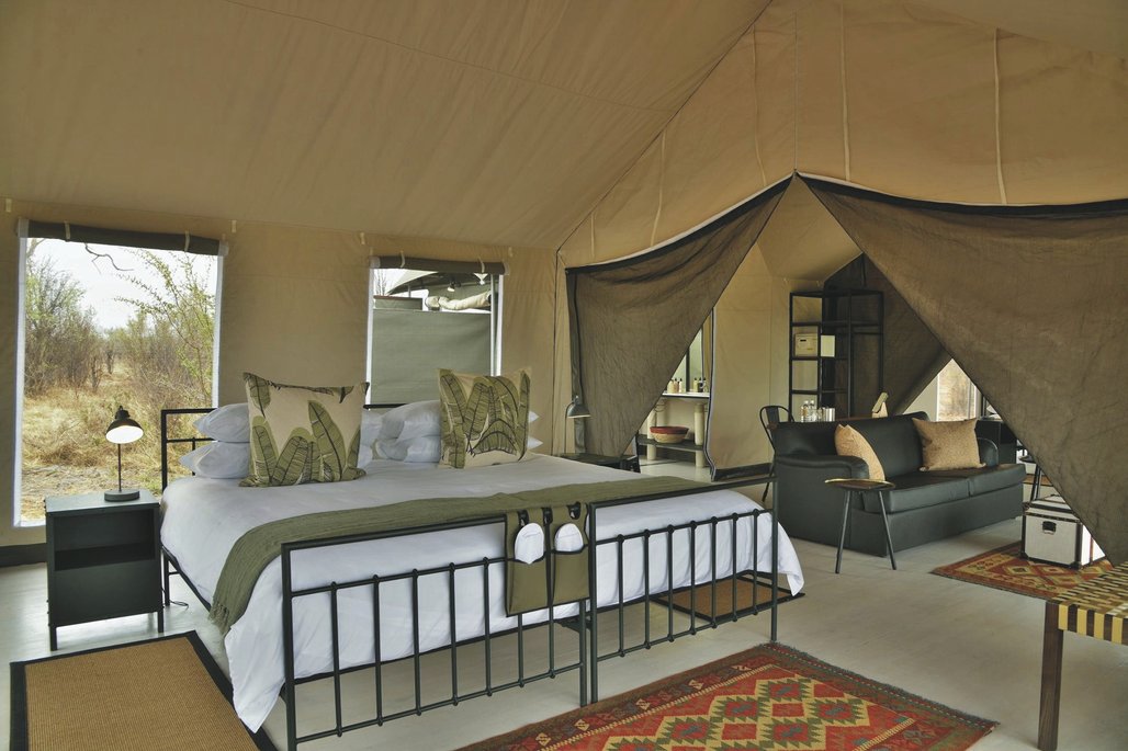 Die zehn geräumigen Safarizelte und zwei Familienzelte stehen auf erhöhten Holzplattformen und verfügen alle über große Betten, ein privates Bad mit WC und Außendusche sowie eine Terrasse mit Blick auf die Kwikamba Pfanne.