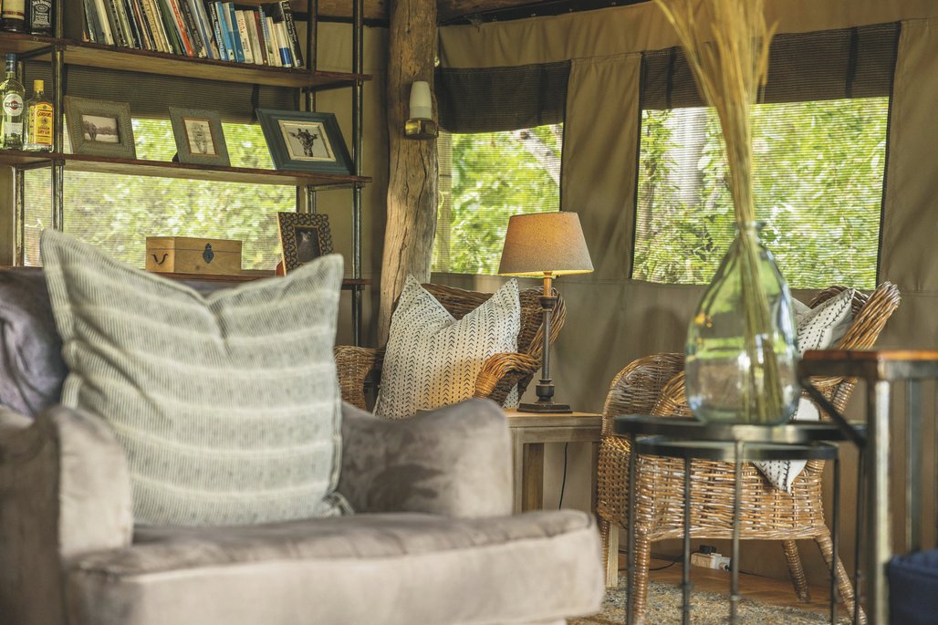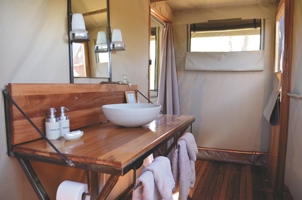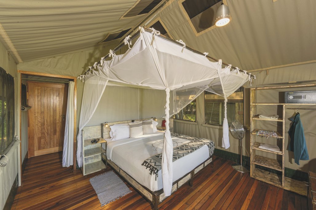 Die Safarizelte bieten einen komfortablen Rückzugsort inmitten der Natur. Jedes der sechs Zelte verfügt über ein eigenes Badezimmer mit einer offenen Dusche, die ein erfrischendes Duscherlebnis im Freien ermöglicht. Zur Ausstattung gehören außerdem ein stehender Ventilator und ein Safe für persönliche Gegenstände.