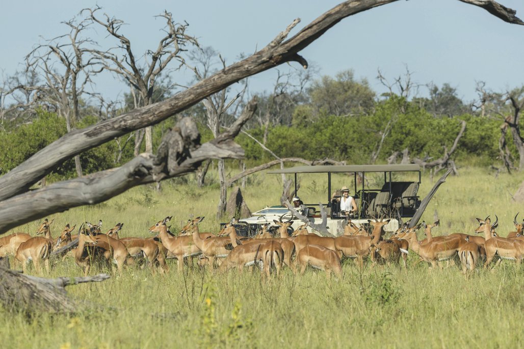 Mit seinen handgefertigten Möbeln und dem klassischem Stil möchte das Sango Safari Camp die Atmosphäre eines mobilen Safaricamps wiederbeleben und eine Verbindung zwischen Rustikalem und Komfort schaffen. Der offene Hauptbereich ist mit einem gemütlichen Speisebereich ausgestattet und die Lounge lädt zum Entspannen ein, während die Bar eine Auswahl an erfrischenden Getränken bietet. Für gesellige Abende steht ein traditioneller Boma-Bereich zur Verfügung, ideal für Lagerfeuer und gemeinsame Erlebnisse unter dem Sternenhimmel. Ein kleiner Pool sorgt für Erfrischung an heißen Tagen und von der Aussichtsplattform aus können die Gäste die atemberaubende Landschaft und Tierwelt des Khwai Gebiets genießen. Angebotene Aktivitäten: Pirschfahrten (Tag & Nacht), Buschwanderungen, Dorfbesuche und Mokorofahrten.