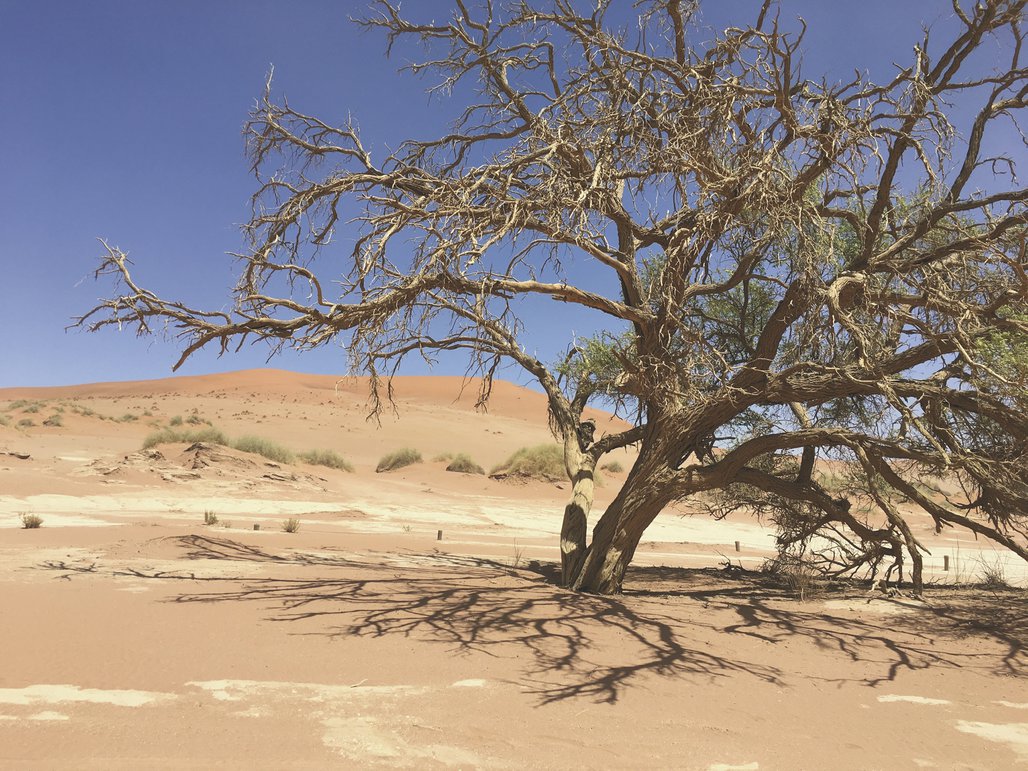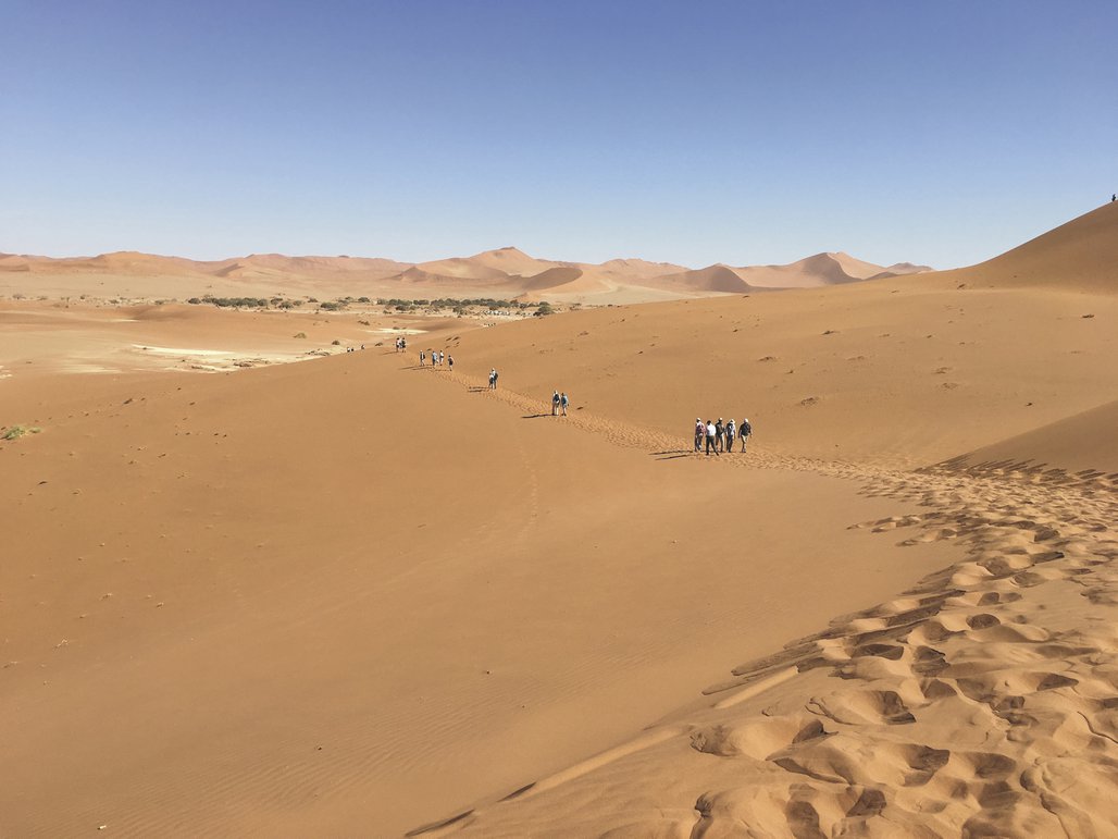 Geführter Ganztagesausflug ins Dünengebiet. Der frühe Morgen ist die schönste Zeit, um das Sossusvlei zu besuchen. Das Farbenspiel ist um diese Tageszeit unglaublich, ein Paradies für Hobbyfotografen und Entschädigung für das frühe Aufstehen. Erklimmen Sie die roten Dünen und genießen Sie den Weitblick. Die hohen Dünen sind eine Herausforderung, immer am Grad entlang durch den weichen Sand geht es hinauf bis auf die Spitze. Auch der Besuch des kleinen Sesriem Canyons ist sehr interessant. Am Grund, im Schatten ist es angenehm kühl und eine unwirkliche Stille empfängt Sie.