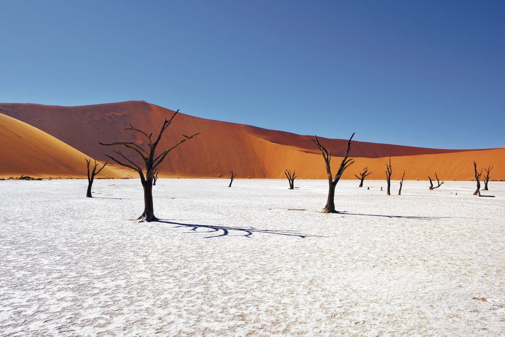 Frühmorgens erleben Sie im Gebiet von Sossusvlei die Dünen im Licht der Morgensonne. Rot leuchtender Sand, blauer Himmel, ein grüner Busch und vielleicht eine weiße Wolke am Himmel – ein Rausch der Farben. Auf der Rückfahrt lohnt ein Besuch des kleinen Sesriem Canyons.