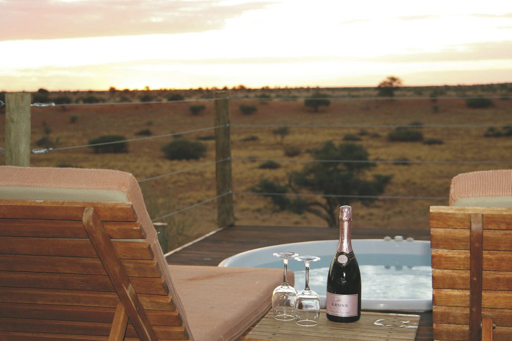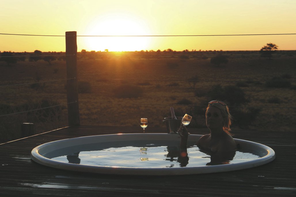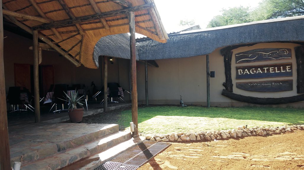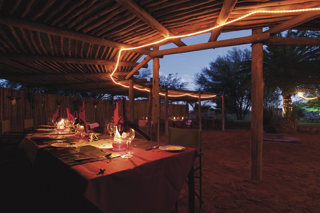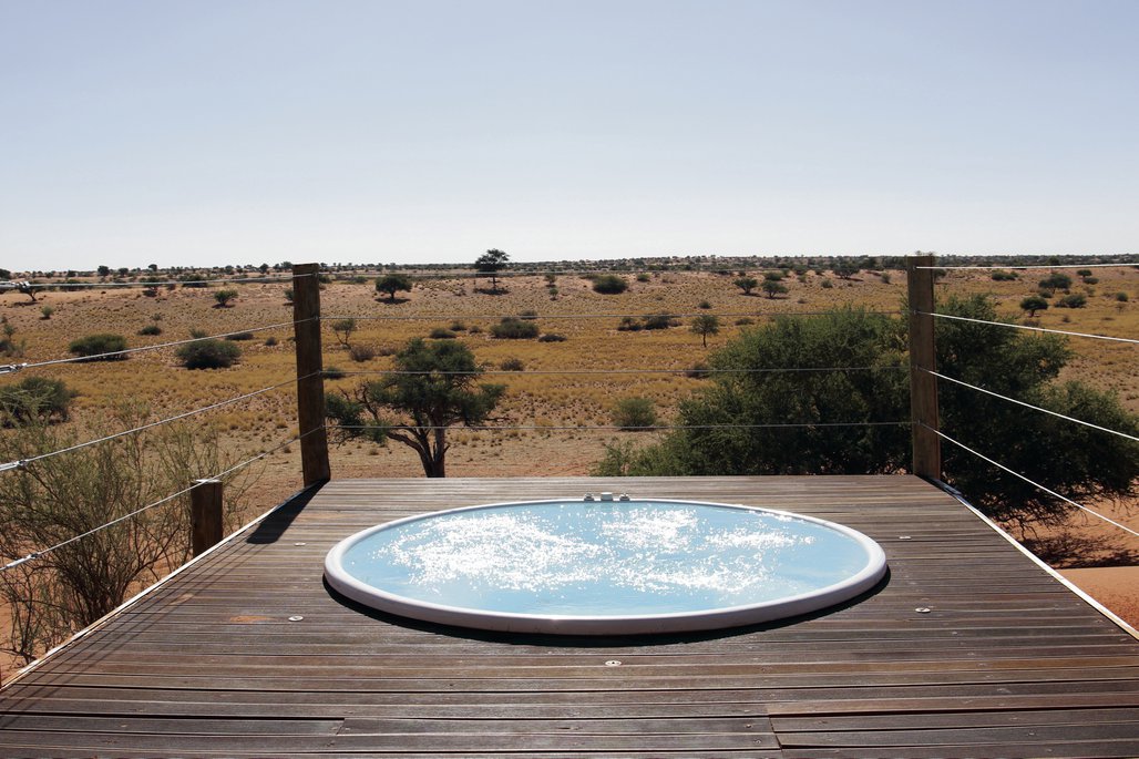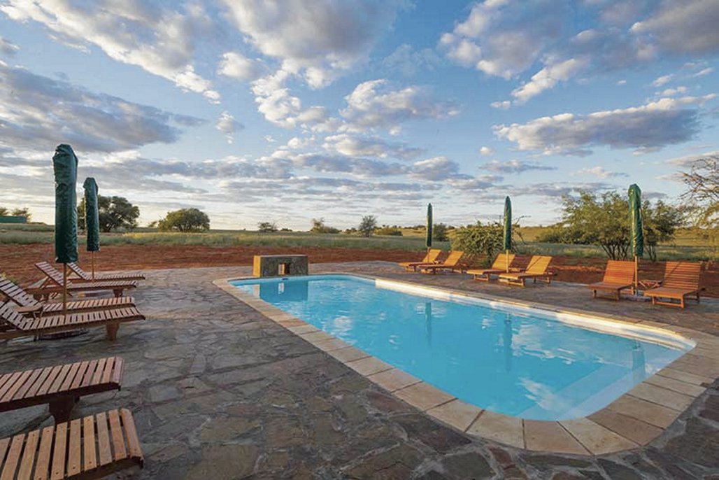 Im alten Farmhaus befinden sich das Restaurant mit Terrasse, die Lounge mit Kamin und WLAN, die Bar, eine kleine Bibliothek und der Weinkeller. Im Garten entspannen Sie am Pool und die Lapa ist der Platz für ein gemütliches Beisammensein und Abendessen mit Lagerfeuerromantik. Überdachter Parkplatz vorhanden. Erleben Sie die Kalahari von ihrer schönsten Seite bei einem Spa-Besuch oder verschiedenen optionalen Aktivitäten: geführte Wanderungen mit den San, Panorama- und Sundowner-Fahrten, geführte Reitsafaris, Sternenbeobachtung mit dem computergesteuerten Teleskop, Besuch der Geparden aus dem Cheetah Conservation Fund.
