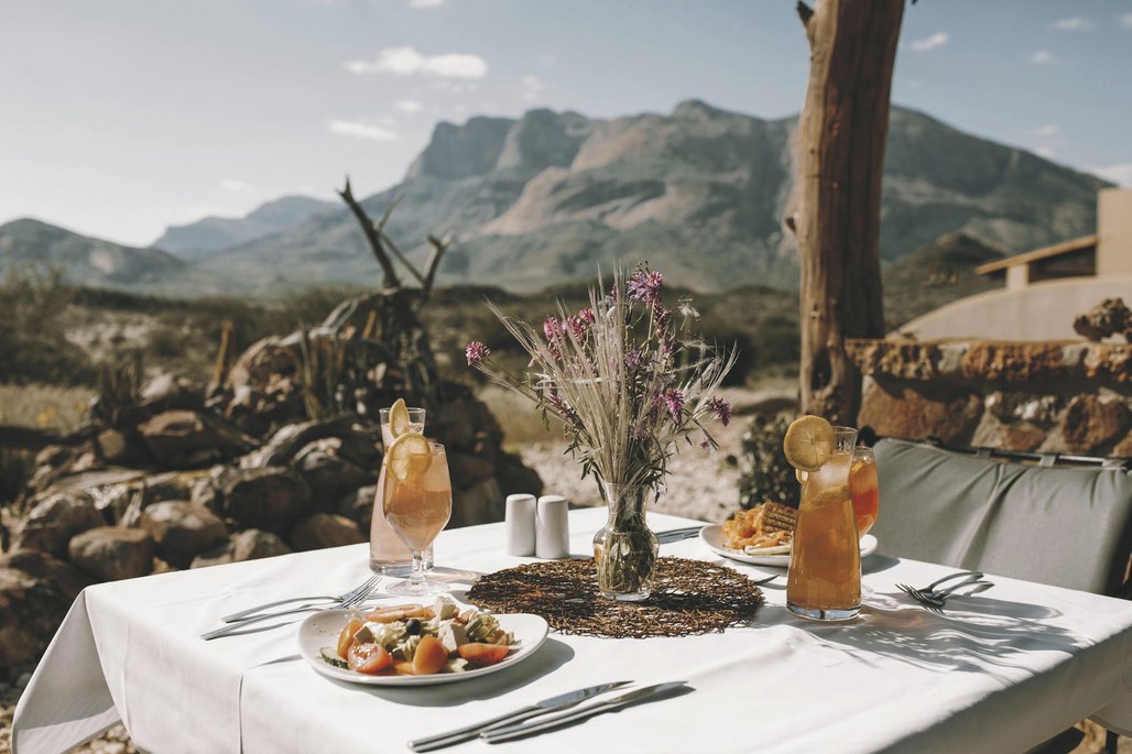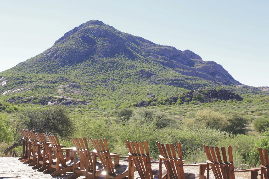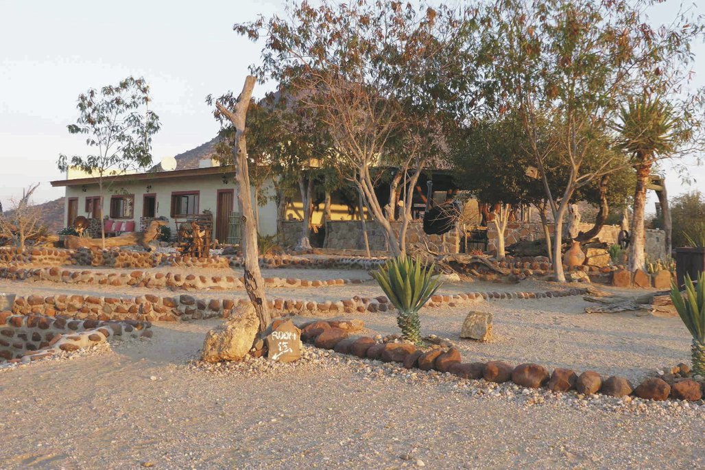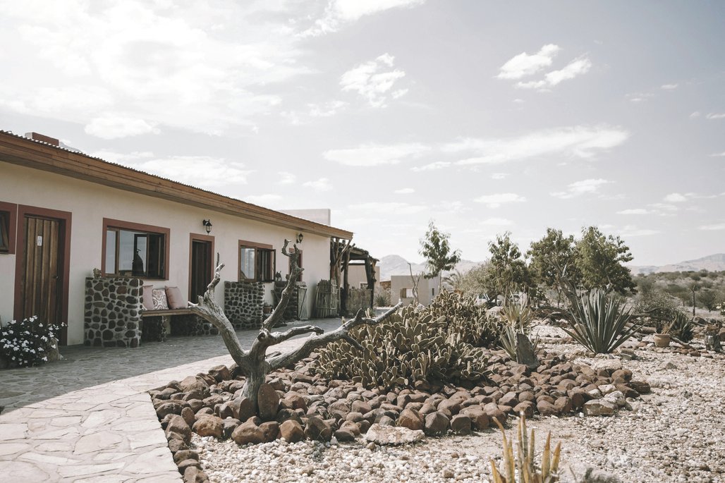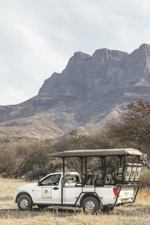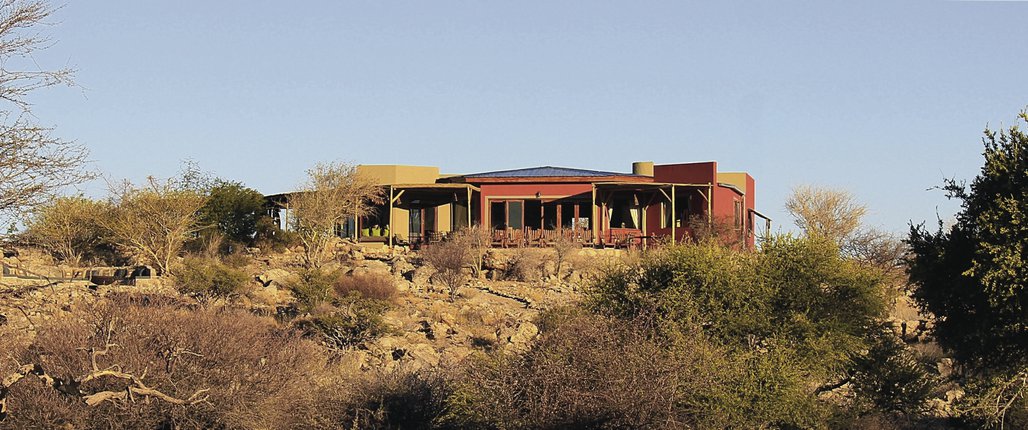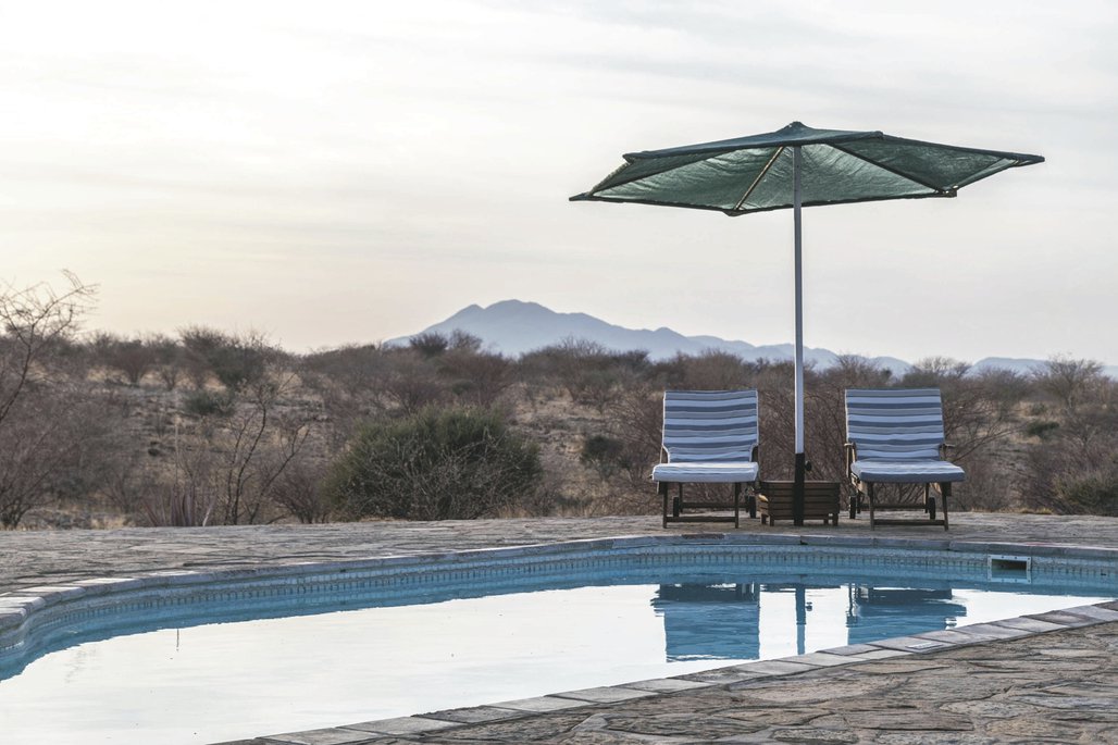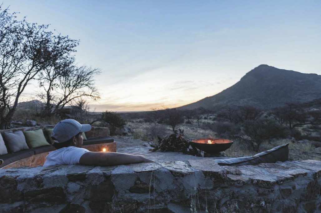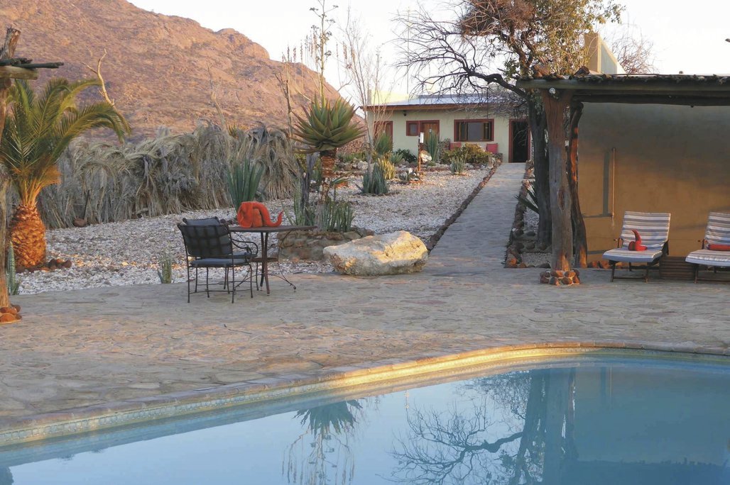 Die Lodge liegt dem höchsten Gipfel des Erongogebirges zu Füßen. Spektakuläre Sonnenuntergänge lassen den Berg in fantastischem roten Licht erscheinen. Im Haupthaus befinden sich das Restaurant, eine Lounge mit Kamin, kostenloses WLAN sowie die Bar und der Cocktail-Bereich. Die Terrasse bietet ein großartiges Panorama und Blick auf das nahe Wasserloch. Auf der Sonnenterrasse am Pool können Sie abschalten und entspannen. Am Abend lässt es sich rund um die flackernde Feuerstelle gut über die Ereignisse des Tages austauschen. Philipps Cave mit seinen Felsmalereien und die Granitformationen von Bulls Party befinden sich gleich auf der Nachbarfarm. Optionale Aktivitäten: geführte Wanderungen, markierte Wanderwege, Panoramafahrten, Besuch der Felsmalereien, Fatbike Verleih.