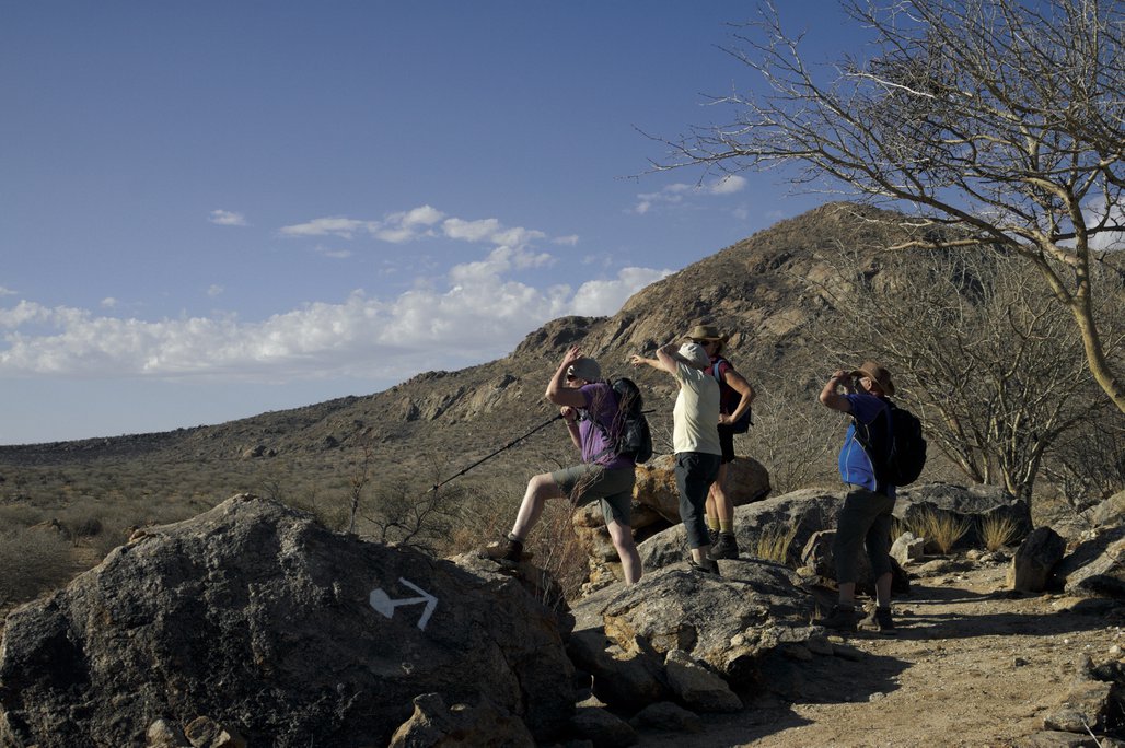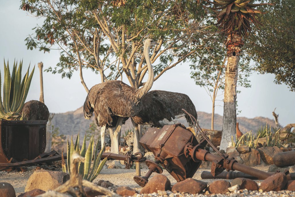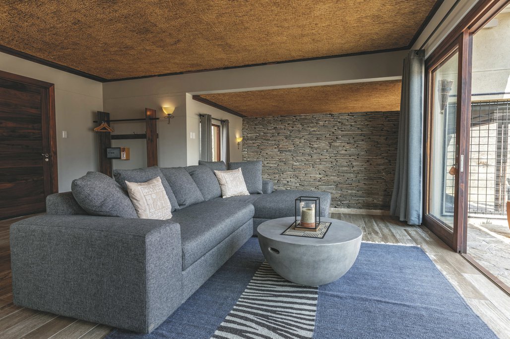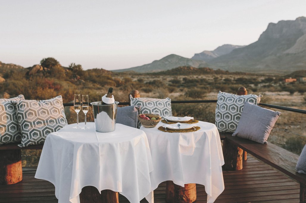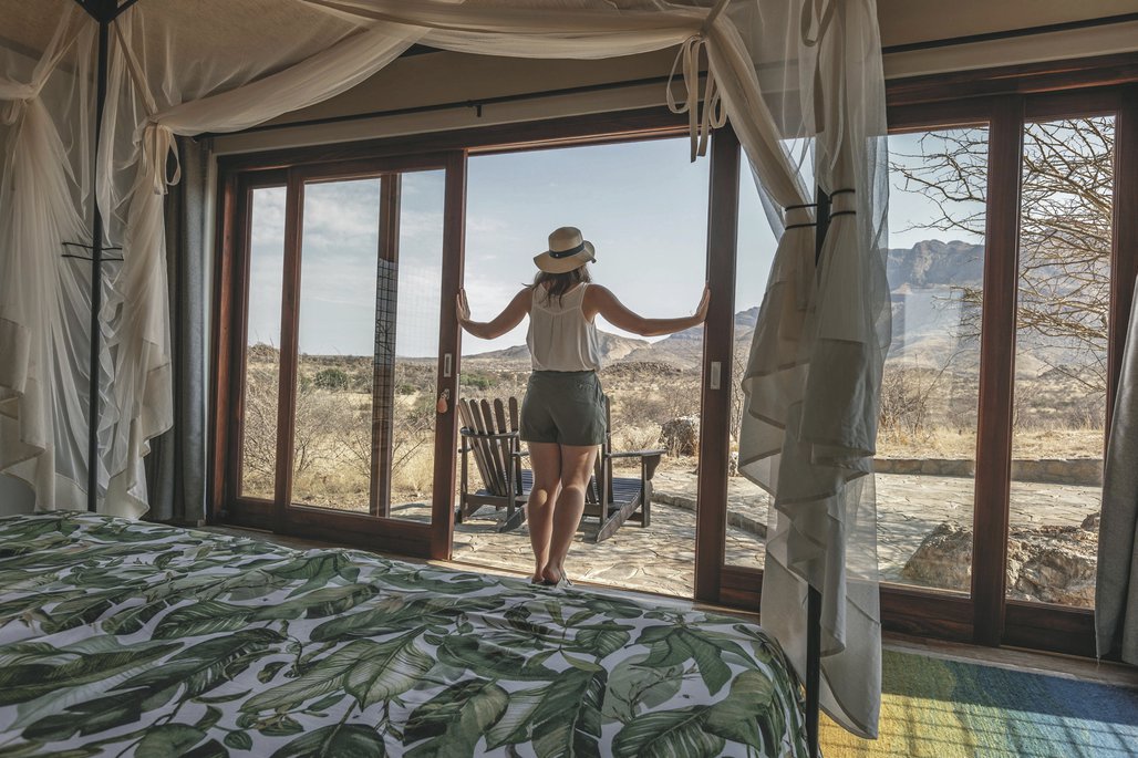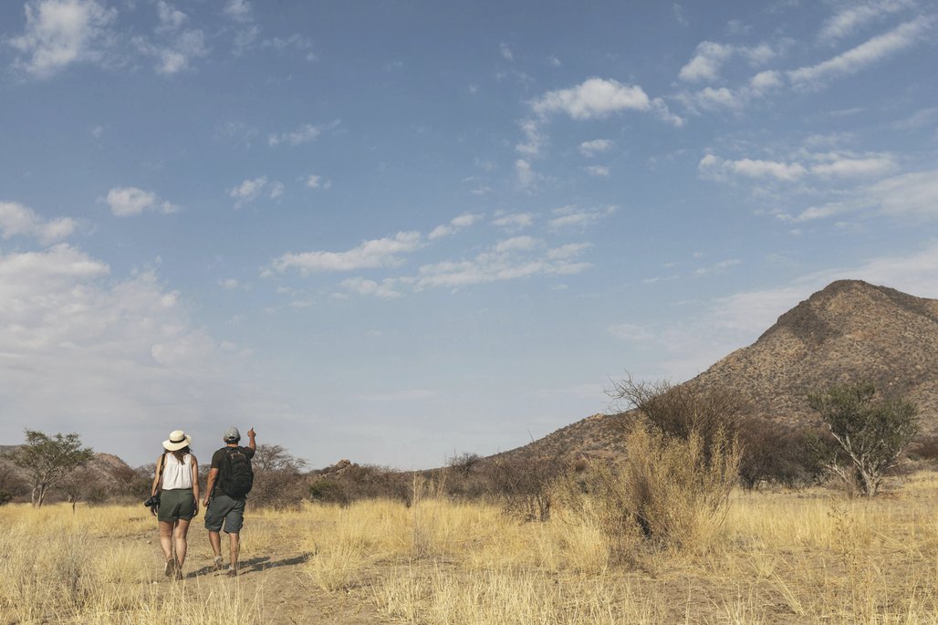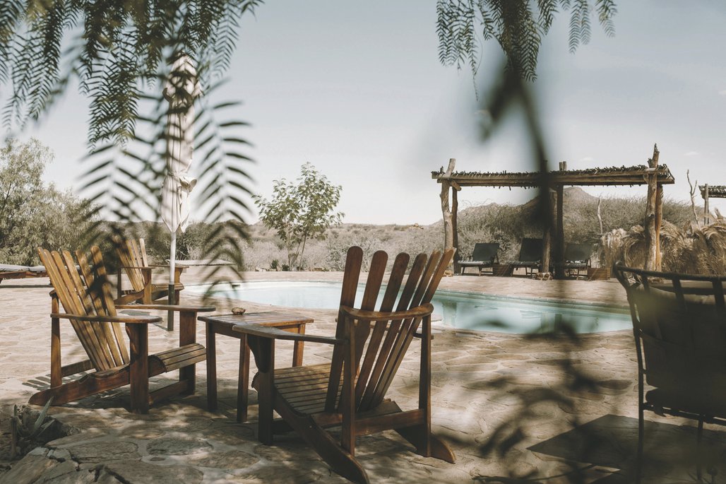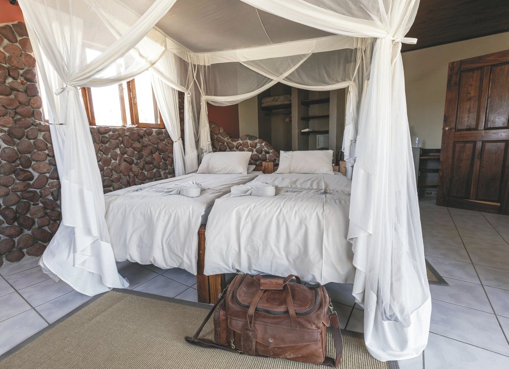 Die Lodge liegt dem höchsten Gipfel des Erongogebirges zu Füßen. Spektakuläre Sonnenuntergänge lassen den Berg in fantastischem roten Licht erscheinen. Im Haupthaus befinden sich das Restaurant, eine Lounge mit Kamin, kostenloses WLAN sowie die Bar und der Cocktail-Bereich. Die Terrasse bietet ein großartiges Panorama und Blick auf das nahe Wasserloch. Auf der Sonnenterrasse am Pool können Sie abschalten und entspannen. Am Abend lässt es sich rund um die flackernde Feuerstelle gut über die Ereignisse des Tages austauschen. Philipps Cave mit seinen Felsmalereien und die Granitformationen von Bulls Party befinden sich gleich auf der Nachbarfarm. Optionale Aktivitäten: geführte Wanderungen, markierte Wanderwege, Panoramafahrten, Besuch der Felsmalereien, Fatbike Verleih.