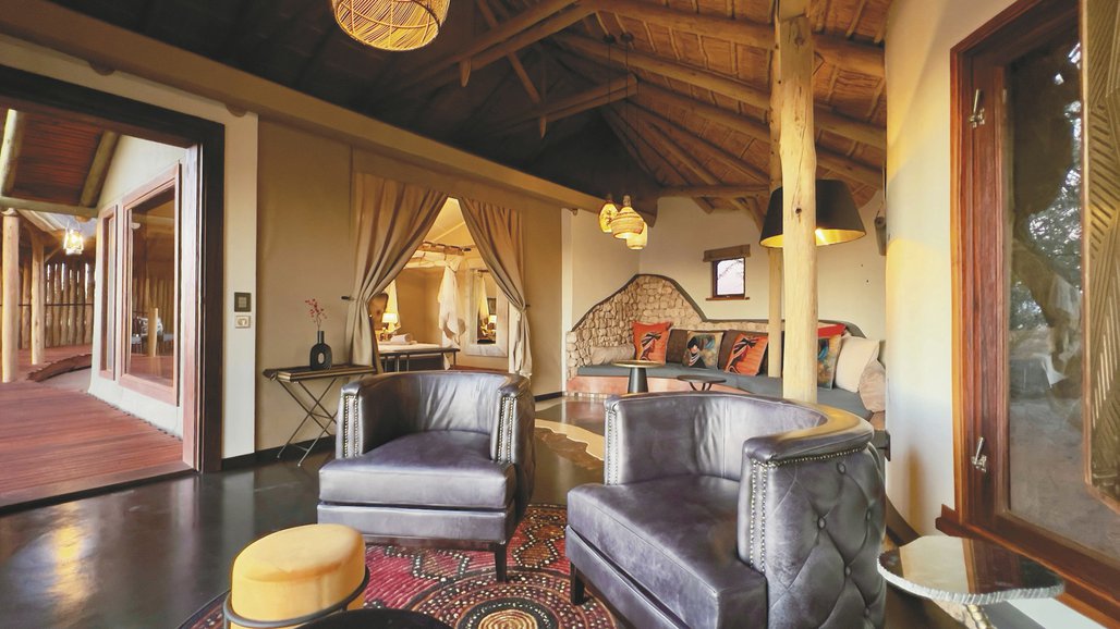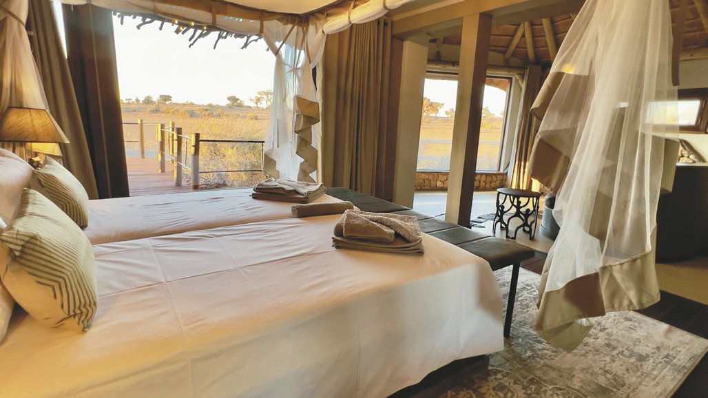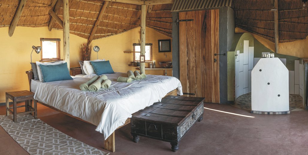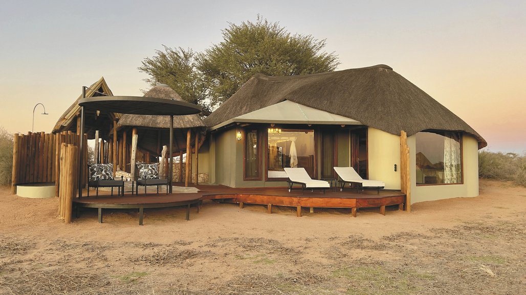 Die 11 großzügigen, riedgedeckten Chalets sind hochmodern und doch sehr afrikanisch. Sie bieten viel Privatsphäre, über Holzstege erreicht man das Haupthaus. Alle Chalets verfügen natürlich über ein eigenes Bad mit Außendusche, große Panoramafenster, die einen traumhaften Blick auf die Landschaft gewähren, einen großen Loungebereich, Moskitonetz, Fön, Tee-/Kaffeezubereiter, Klimaanlage, Safe, Kühlschrank und eine überdachte Terrasse. Ein Chalet ist mit 2 Schlafzimmern perfekt für Familien geeignet. Das Superior-Chalet ist deutlich größer, Hauptaugenmerk ist sicherlich der tolle Außenbereich mit eigenem Plunge Pool und geräumiger Terrasse. Der Raumzuschnitt ist weitläufig und darauf ausgelegt, von 3 verschiedenen Ebenen Blickachsen zu erleben. Große Fenster ermöglichen ein Naturerlebnis im Vlei, das Beobachten der Tiere an der nahe gelegenen Wasserstelle und den Ausblick in die afrikanische Savannenlandschaft der Kalahari. Edel und modern ausgestattet ist dieses Haus eine Klasse für sich.