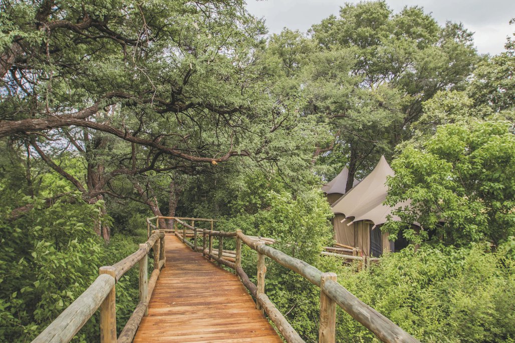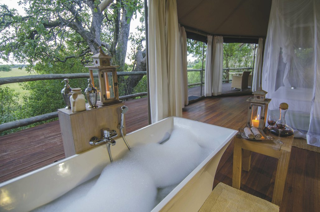 Hoch über dem Boden über Holzstege erreichen Sie Ihr Heim auf Zeit in rund 5 m Höhe auf Holzplattformen. Die 10 geräumigen und exquisiten Safarizelte sind geschmackvoll in natürlichen Farben dekoriert. Jedes verfügt über eine großzügige Lounge, ein offenes, modernes und helles Bad sowie Safe, Fön, Ventilator, Moskitonetz und eine große Terrasse mit traumhafter Aussicht auf die Überflutungsgebiete des Kwando Flusses.
