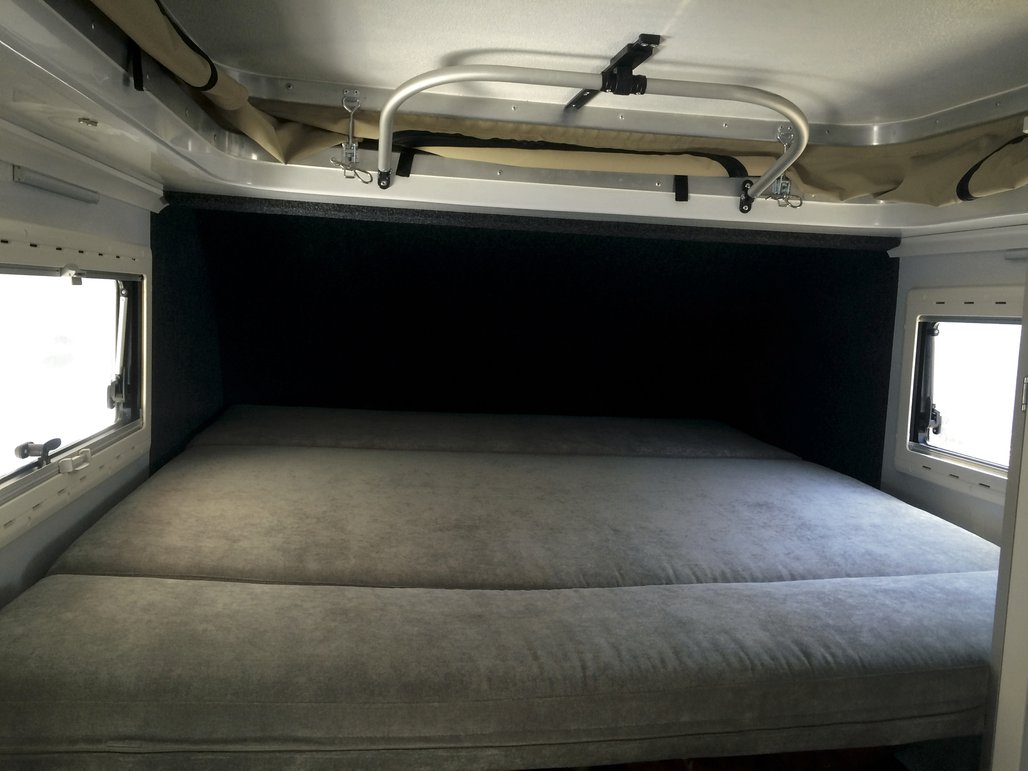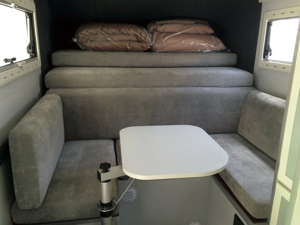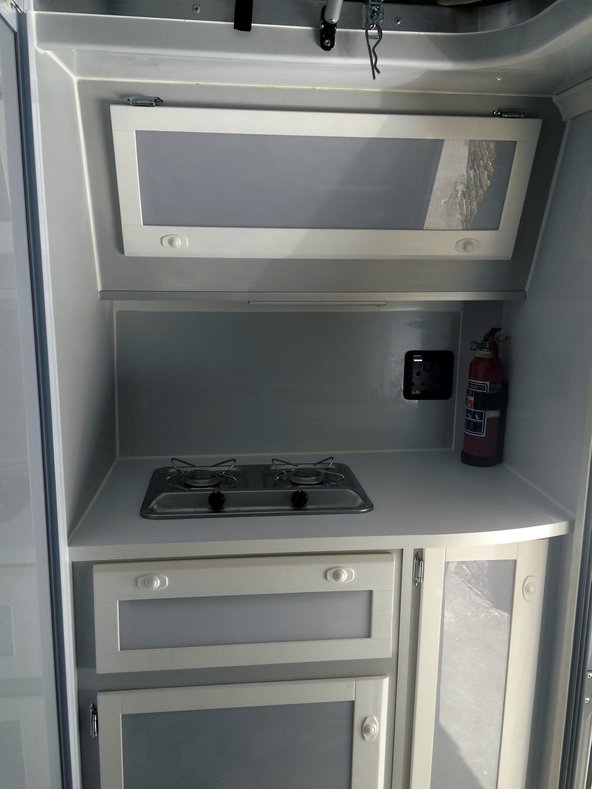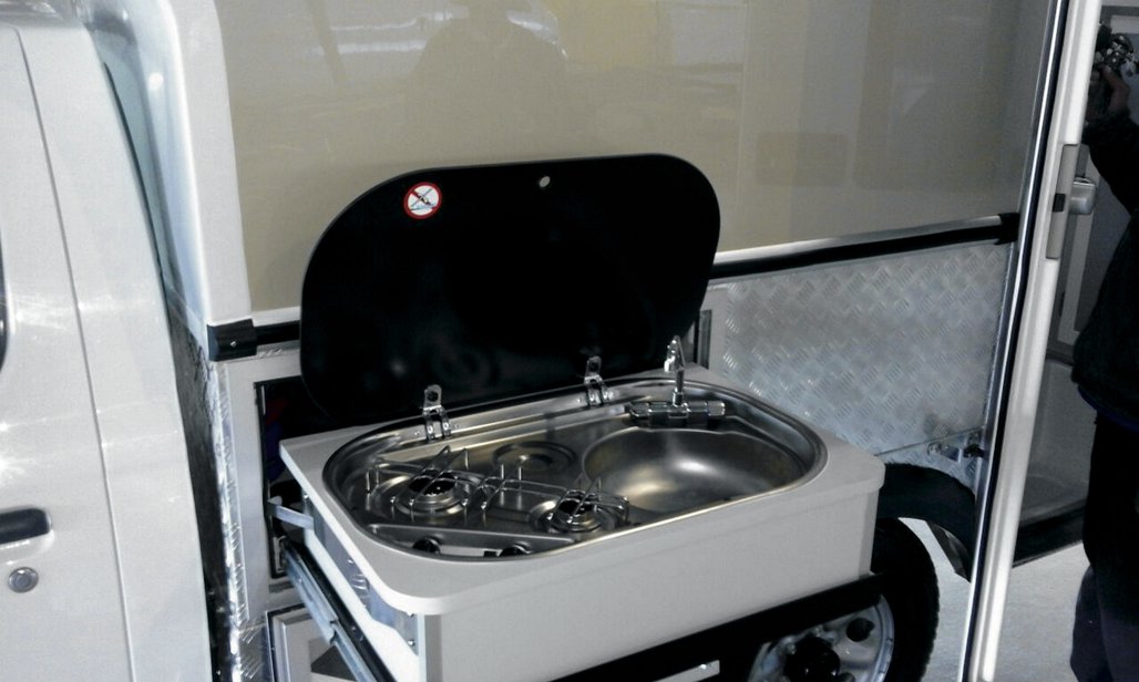 - Wohnkabine mit seitlichem Zugang, aufklappbarem Dach, Sitzgruppe mit Esstisch, Toilettenraum mit Chemie-WC und Außen-Handdusche; zwei 2-flammige Gasherde (innen und außen)