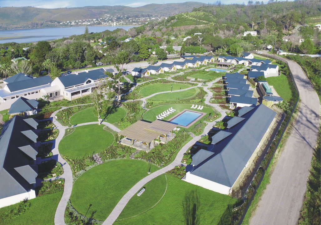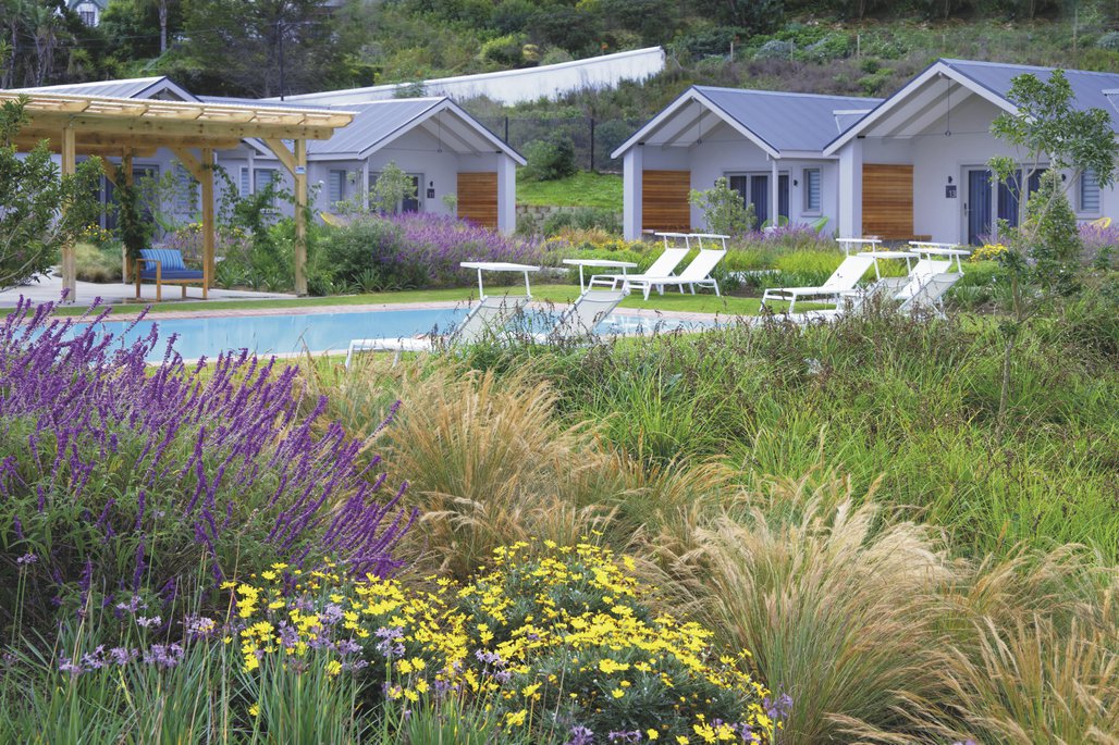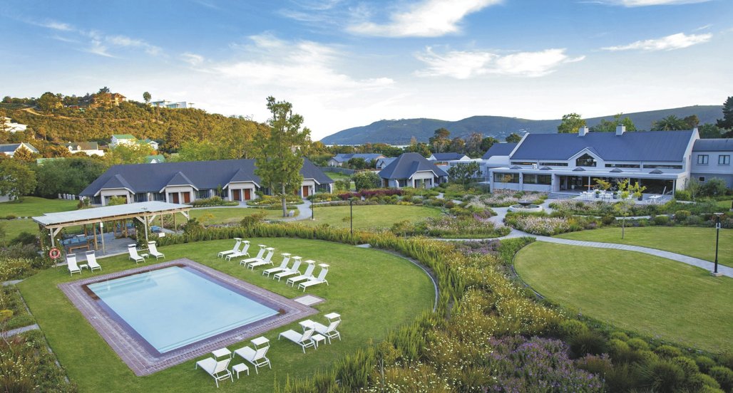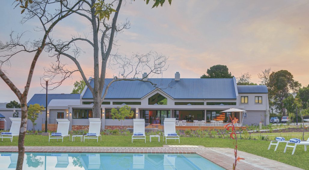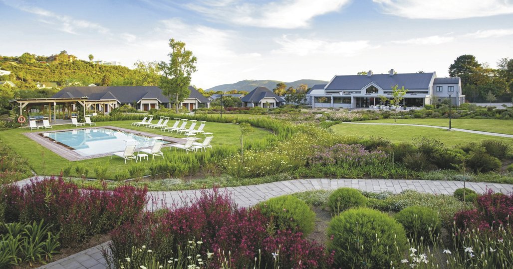 Das moderne Country Estate liegt in einer schönen, weitläufigen 3 Hektar großen Gartenanlage; bunte Blumen, Fynbos und Lavendel gemischt mit Gräser bilden das ganze Jahr hindurch einen blühenden Teppich. Die Suiten gruppieren sich um die 2 Pools und die Sonnenterrassen. Im Hauptbereich dominieren klare Linien, warmes Holz und große Fensterfronten, hier finden Sie das weitläufige Restaurant und den Barbereich, bei gutem Wetter können Sie draußen auf der Terrasse sitzen. Erlesene Weine, nicht nur aus Südafrika, stehen im Weinkeller zur Auswahl, dieser Bereich steht auch für ein privates, romantisches Abendessen zu besonderen Anlässen auf Anfrage zur Verfügung. Im Außenbereich warten ein Boule-Platz und zwei Padel-Plätze darauf bespielt zu werden. Wer die Umgebung gerne aktiv erkunden möchte sollte dem hauseigenen Fahrrad-Verleih einen Besuch abstatten.