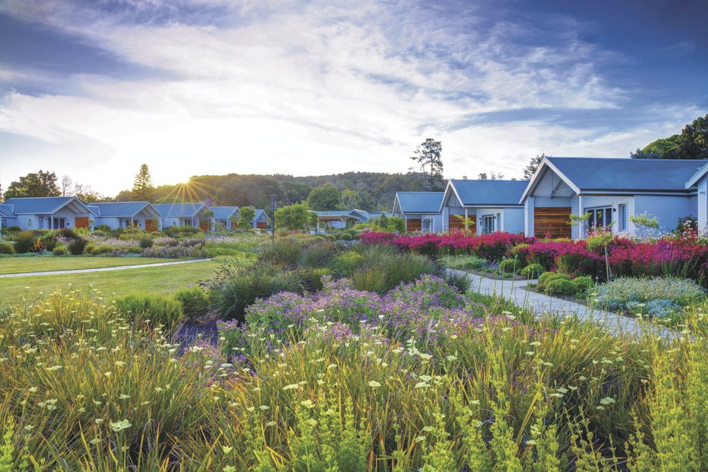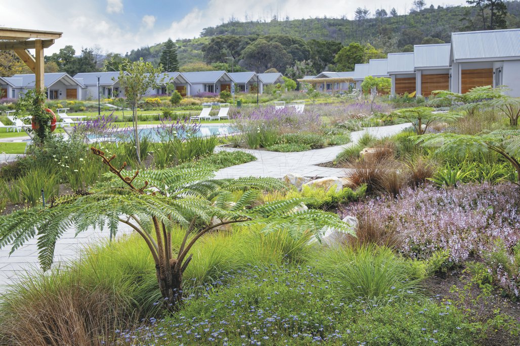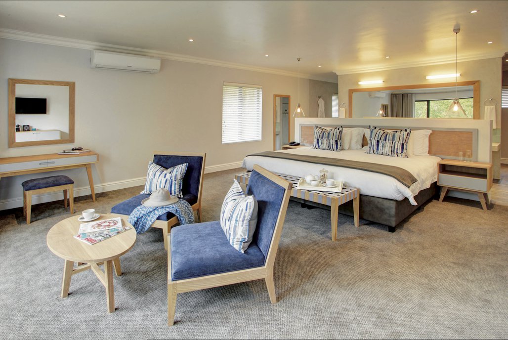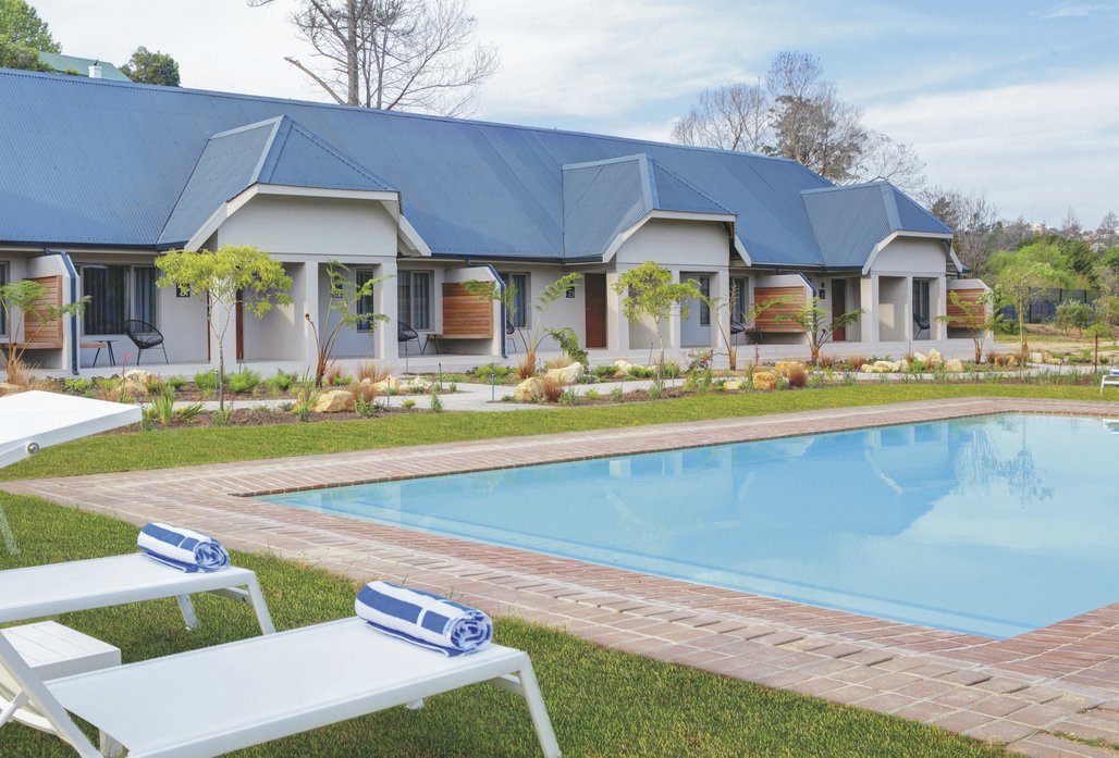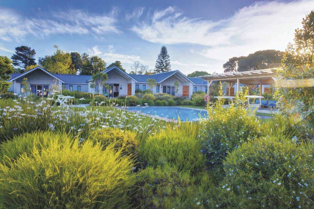 Das moderne Country Estate liegt in einer schönen, weitläufigen 3 Hektar großen Gartenanlage; bunte Blumen, Fynbos und Lavendel gemischt mit Gräser bilden das ganze Jahr hindurch einen blühenden Teppich. Die Suiten gruppieren sich um die 2 Pools und die Sonnenterrassen. Im Hauptbereich dominieren klare Linien, warmes Holz und große Fensterfronten, hier finden Sie das weitläufige Restaurant und den Barbereich, bei gutem Wetter können Sie draußen auf der Terrasse sitzen. Erlesene Weine, nicht nur aus Südafrika, stehen im Weinkeller zur Auswahl, dieser Bereich steht auch für ein privates, romantisches Abendessen zu besonderen Anlässen auf Anfrage zur Verfügung. Im Außenbereich warten ein Boule-Platz und zwei Padel-Plätze darauf bespielt zu werden. Wer die Umgebung gerne aktiv erkunden möchte sollte dem hauseigenen Fahrrad-Verleih einen Besuch abstatten.