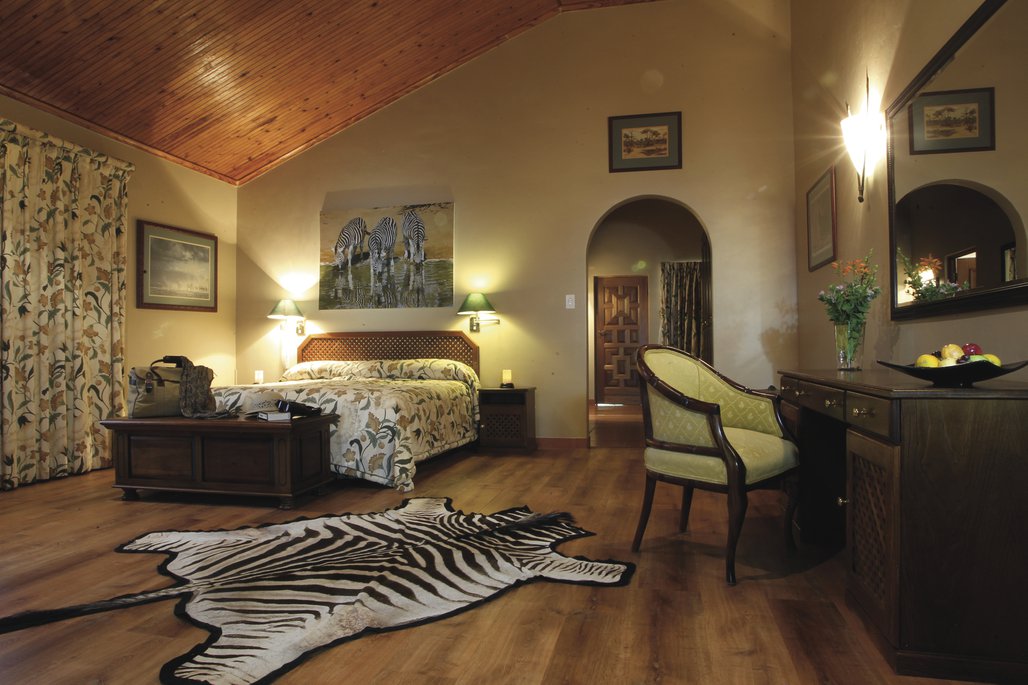 Die 7 eleganten, individuell eingerichteten und geräumigen Suiten liegen im Garten etwas abseits des Haupthaus und bieten bereits beim Aufwachen einen atemberaubenden Blick auf das tiefer gelegene Wildreservat. Neben einem luxuriösen Badezimmer sind die Suiten ausgestattet mit einem Fön, Safe, Minibar, Tee-/Kaffeezubereiter sowie kostenfreiem WLAN, auf weitere Technik wurde bewusst verzichten, einen Fernseher finden Sie im Haupthaus. 3 Treppenstufen führen Sie vom Schlafzimmer in den Loungebereich und dann weiter auf eine große überdachte Terrasse. Die Honeymoon-Suite überrascht mit einer unvergleichlichen Aussicht, einem Marmorbad und einer separaten Lounge, gehalten in kräftigen Erdfarben. Für Familien mit größeren Kindern gibt es es die Möglichkeit zwei nebeneinander liegenden Suiten zu buchen, über den Balkon sind diese miteinander verbunden. Kleinere Kinder können in einem zusätzlichen Bett in der Suite der Eltern komfortabel untergebracht werden.