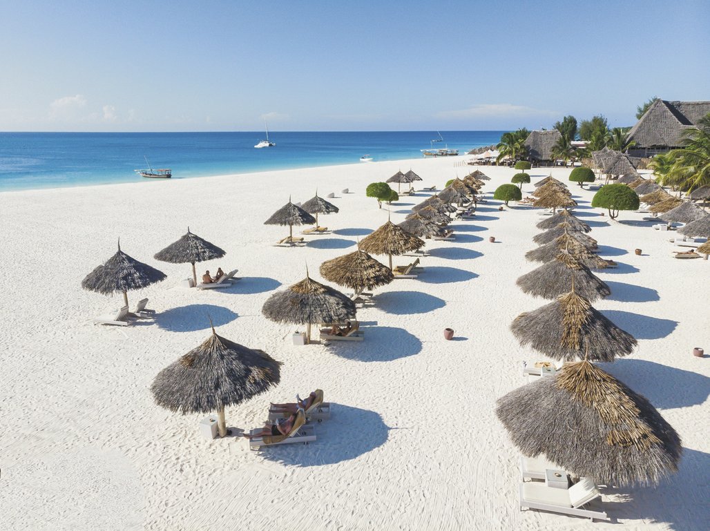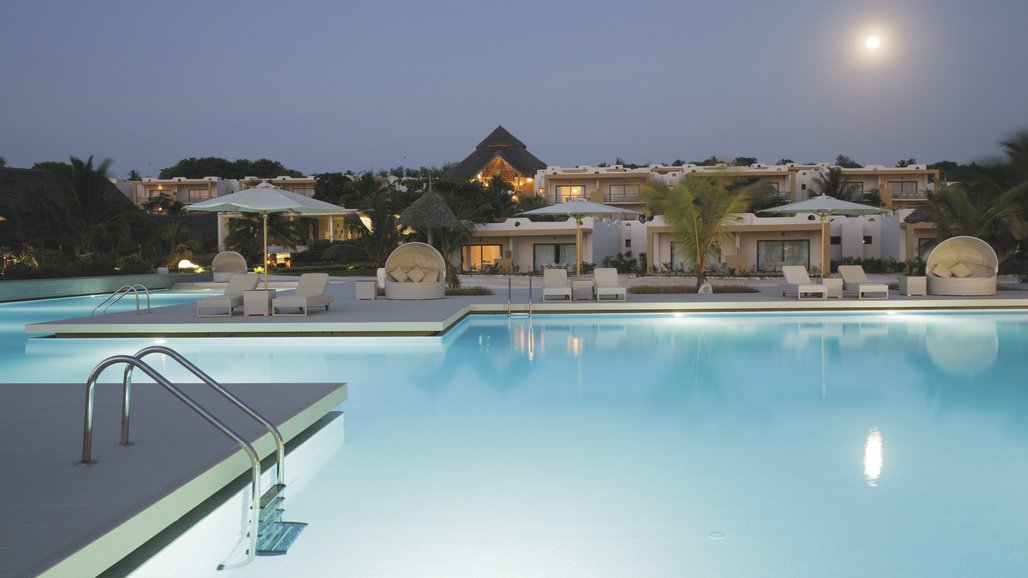 Luxuriöses Resort am Strand von Kendwa, der bekannt ist für sein ruhiges türkisfarbenes Wasser.