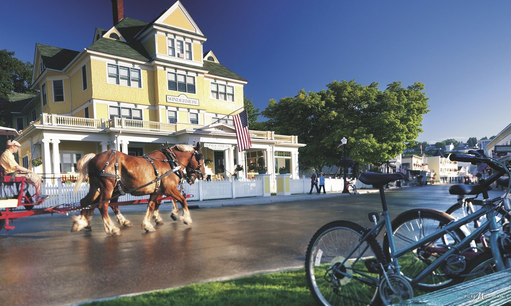 Willkommen auf Mackinac Island! Sie können die Insel zum Beispiel mit dem Fahrrad umrunden, an Cottages aus viktorianischer Zeit vorbei spazieren, Reiten, Golf spielen oder im "Butterfly House" in die Welt der Schmetterlinge eintauchen. Im altehrwürdigen Grand Hotel können Sie die 200 m lange Veranda bestaunen.