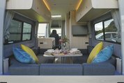 Sitzgruppe im Heck, wahlweise zum Doppelbett (1,83 x 1,79 m) oder zwei Einzelbetten (je 1,83 x 0,60 m) umbaubar.